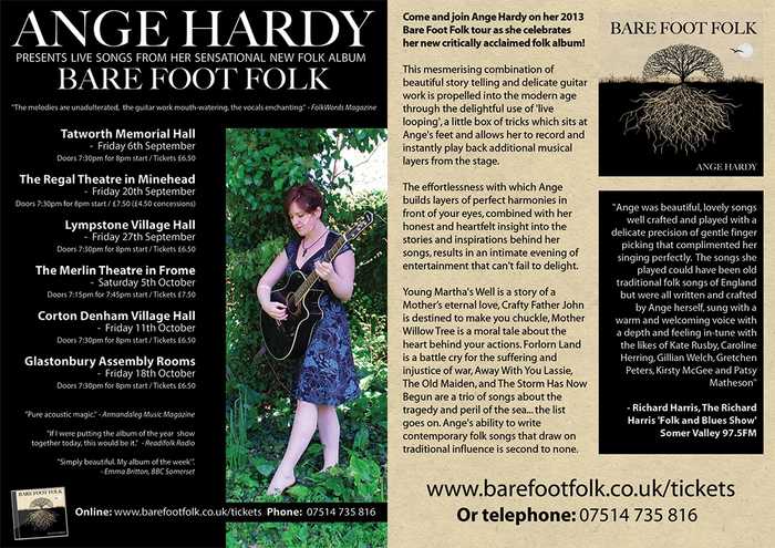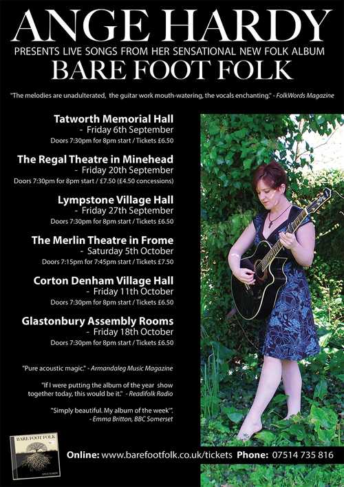 After launching the album at the Silver Street Sessions in her home town of Wiviliscombe Ange will be performing on the weekends through September and October 2013 in Devon and Somerset as the start of her Bare Foot Folk tour which she plans to continue with a wider spread wing next year.